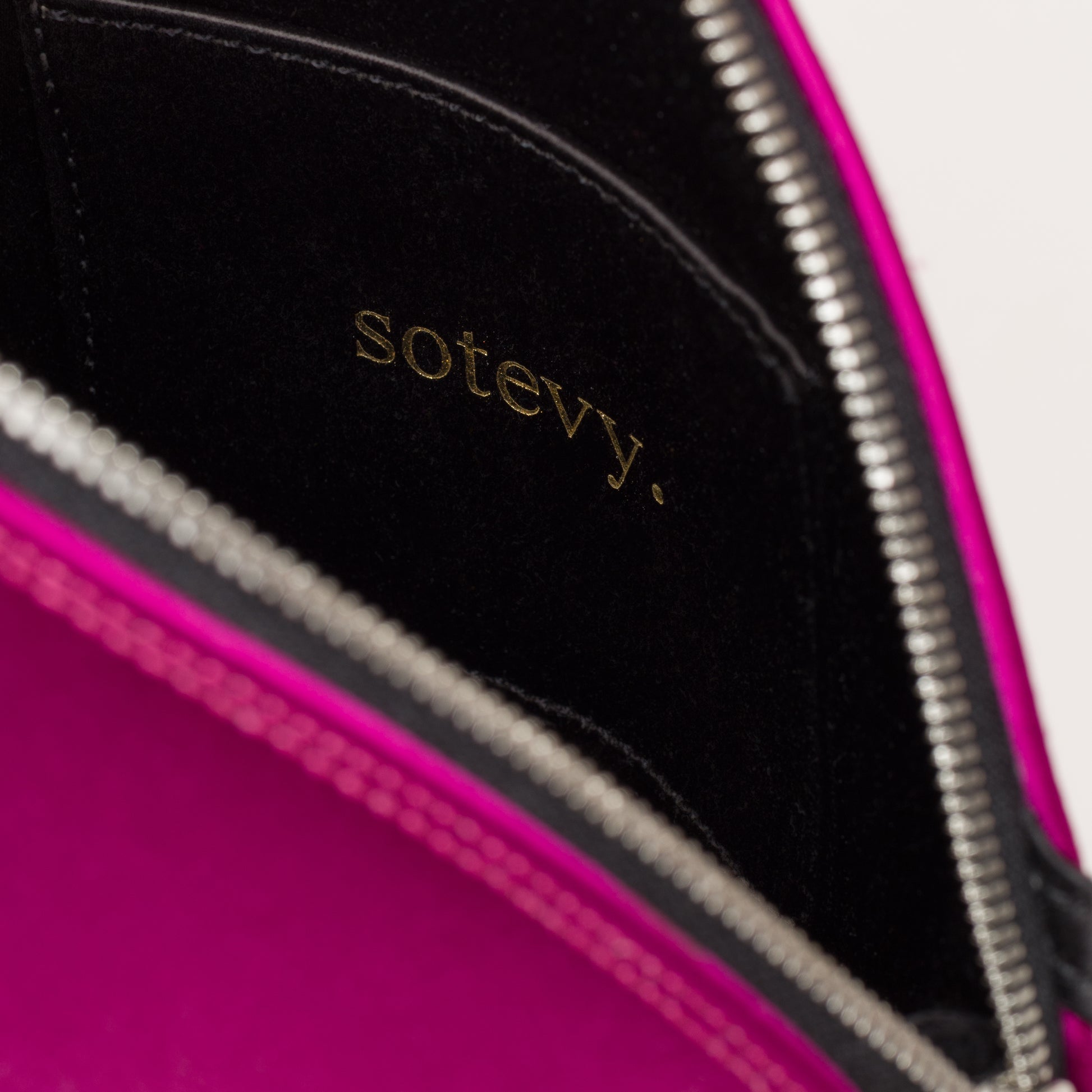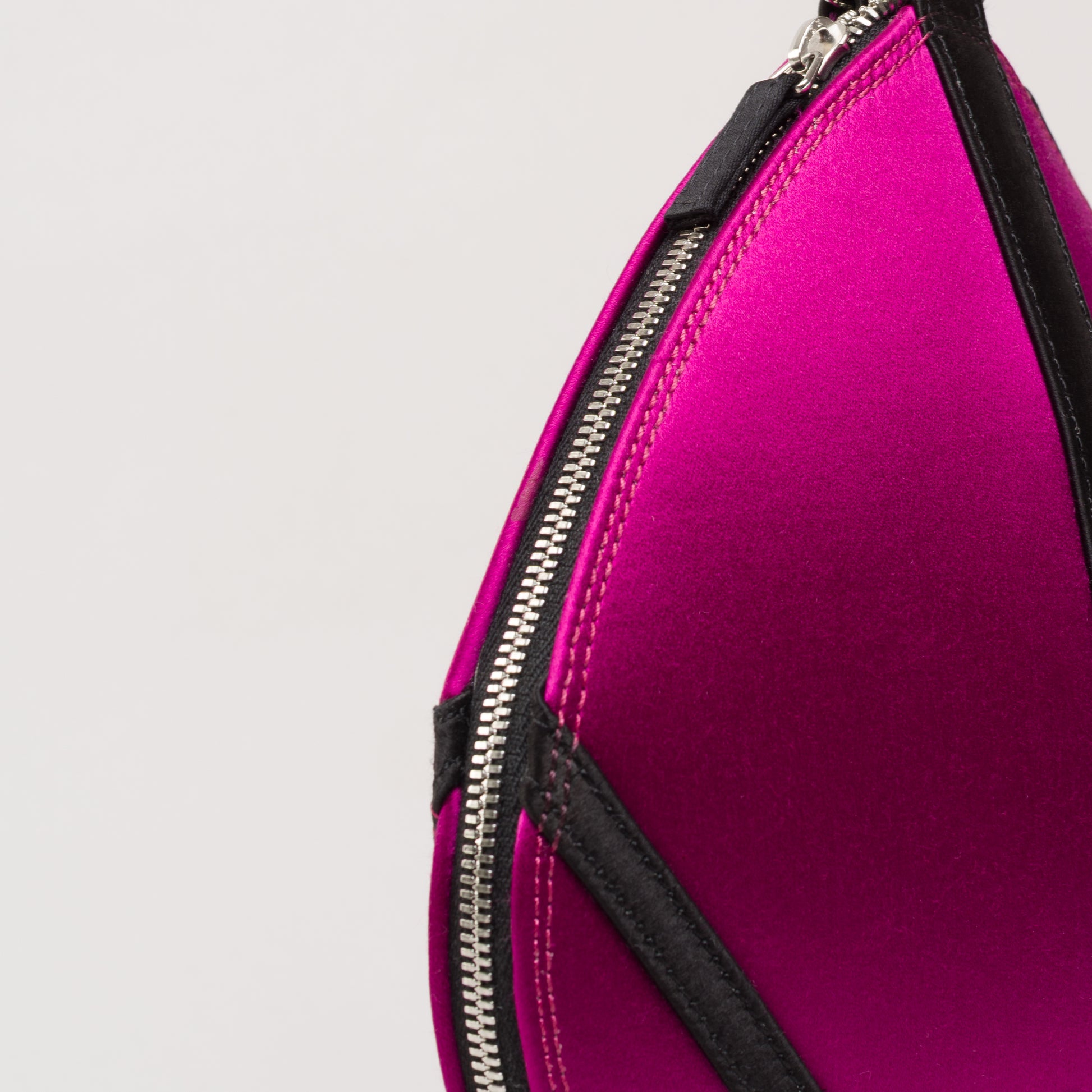 The Lily handbag is a statement of timeless elegance, crafted with meticulous attention to detail. Adorned with contrasted black and fuchsia satin cutouts, it is finished with an exquisite tassel for a touch of sophistication. Its graceful oval silhouette opens seamlessly with dual zippers, unveiling an interior that offers just the right amount of space for your phone, cards, and other daily essentials. The handle wraps comfortably around your wrist, giving you the freedom to move effortlessly while adding a chic flair to any outfit. Perfect for day-to-night transitions, the Lily handbag is the ultimate blend of style and functionality.