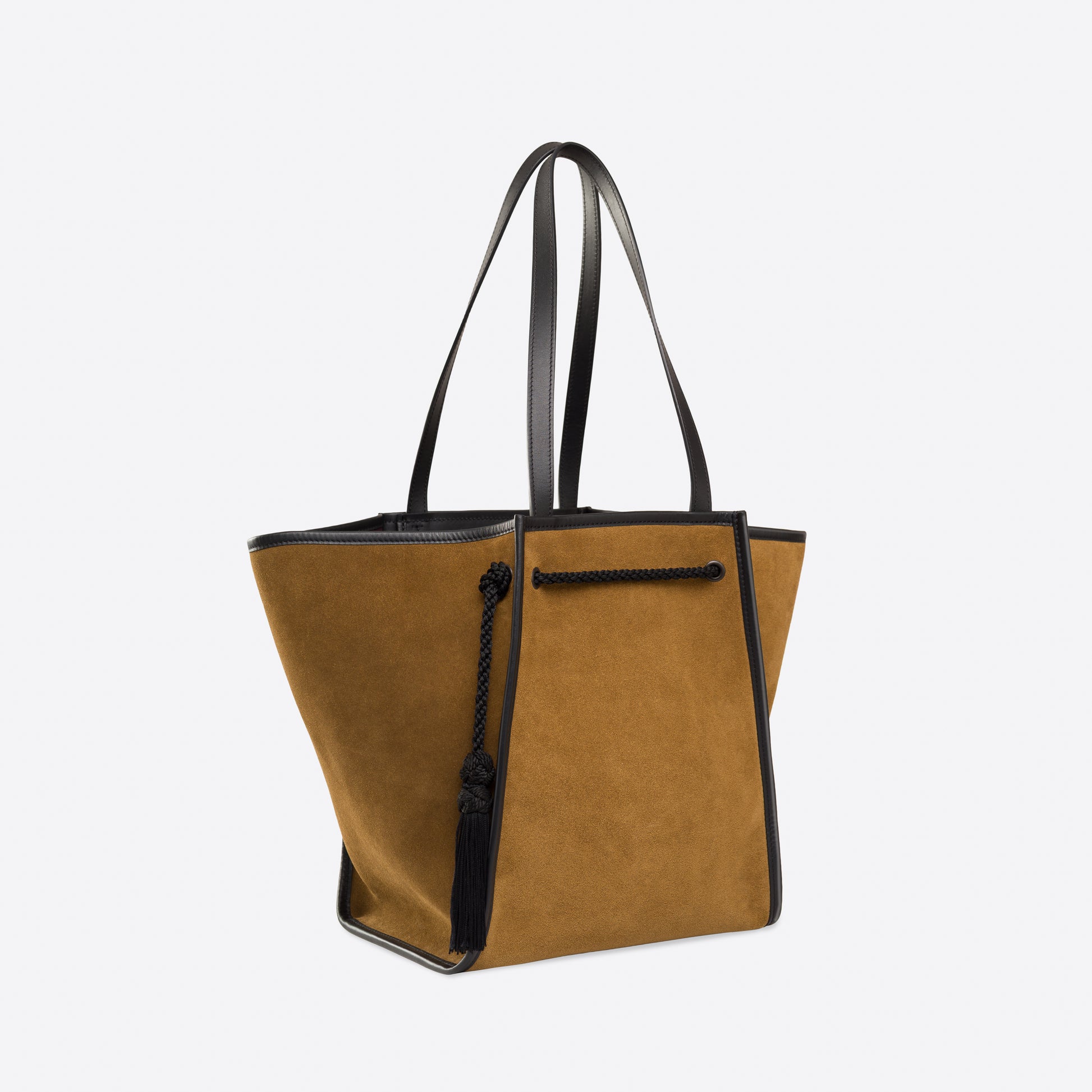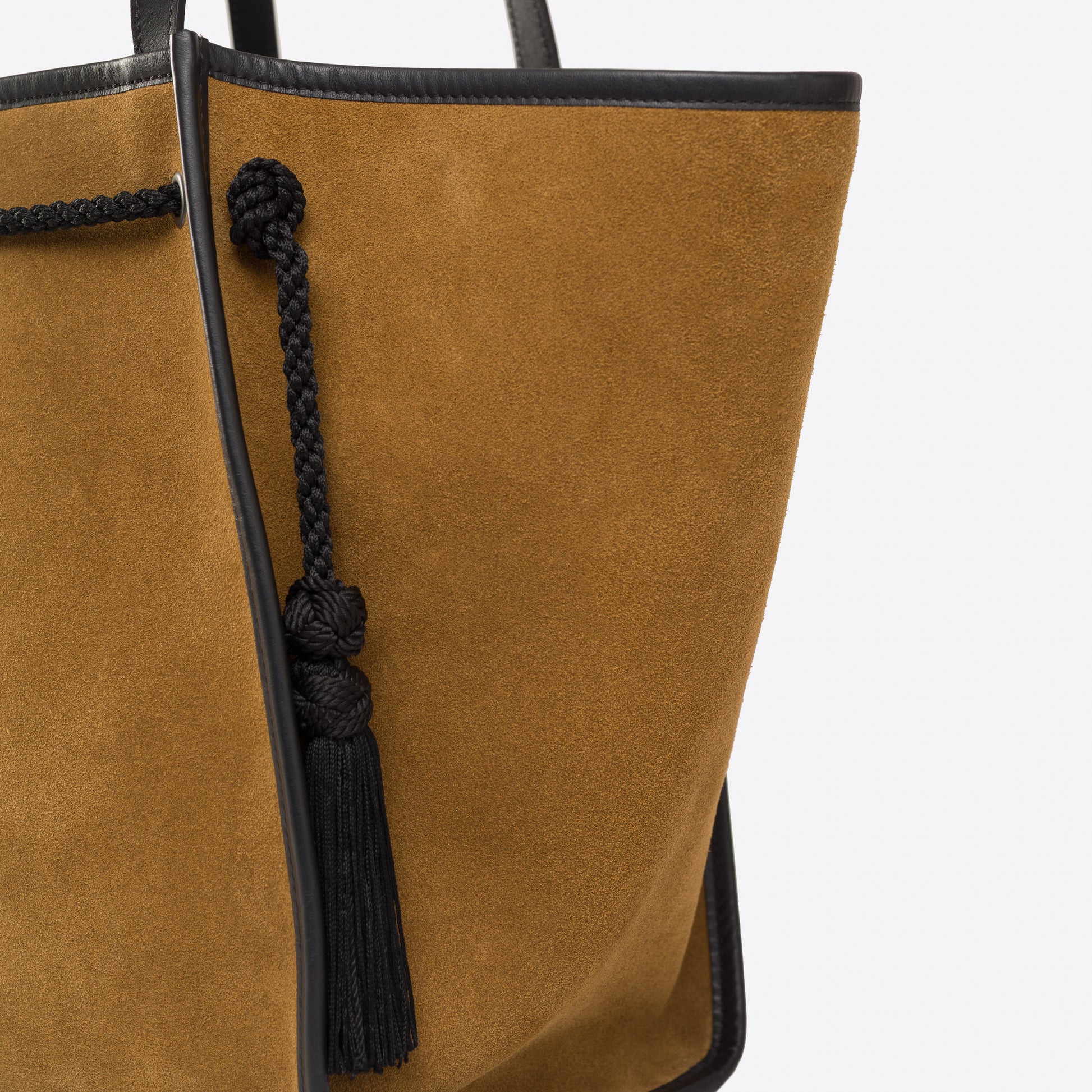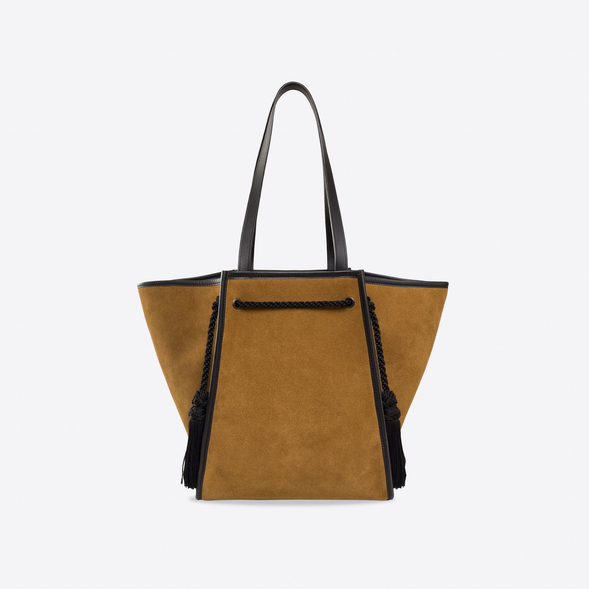 - Outside: Tobacco suede, with black smooth leather bottom and handles. Black trim and tassels.
