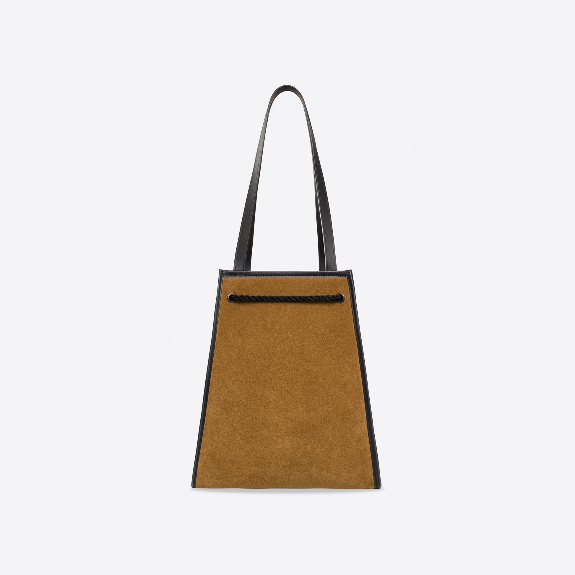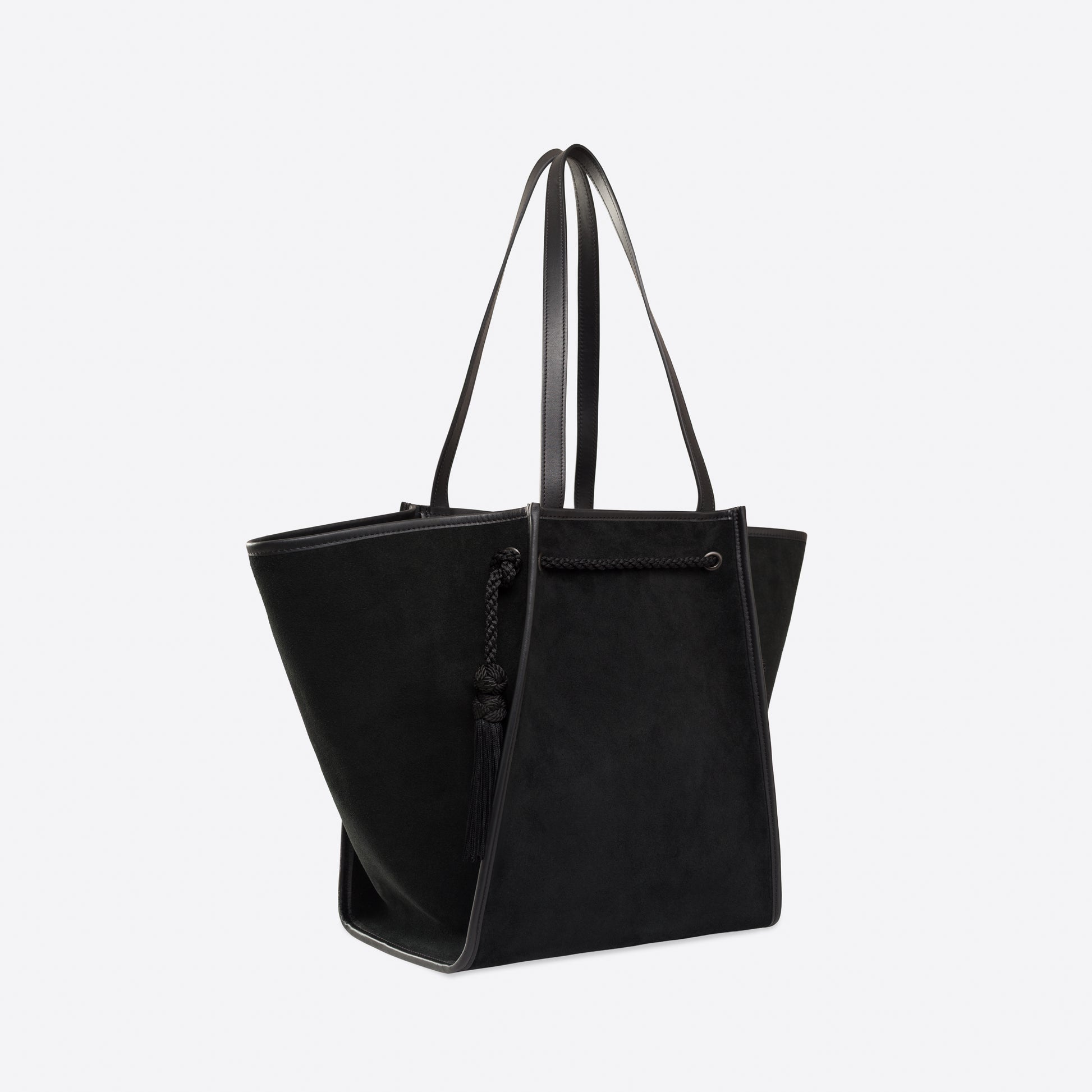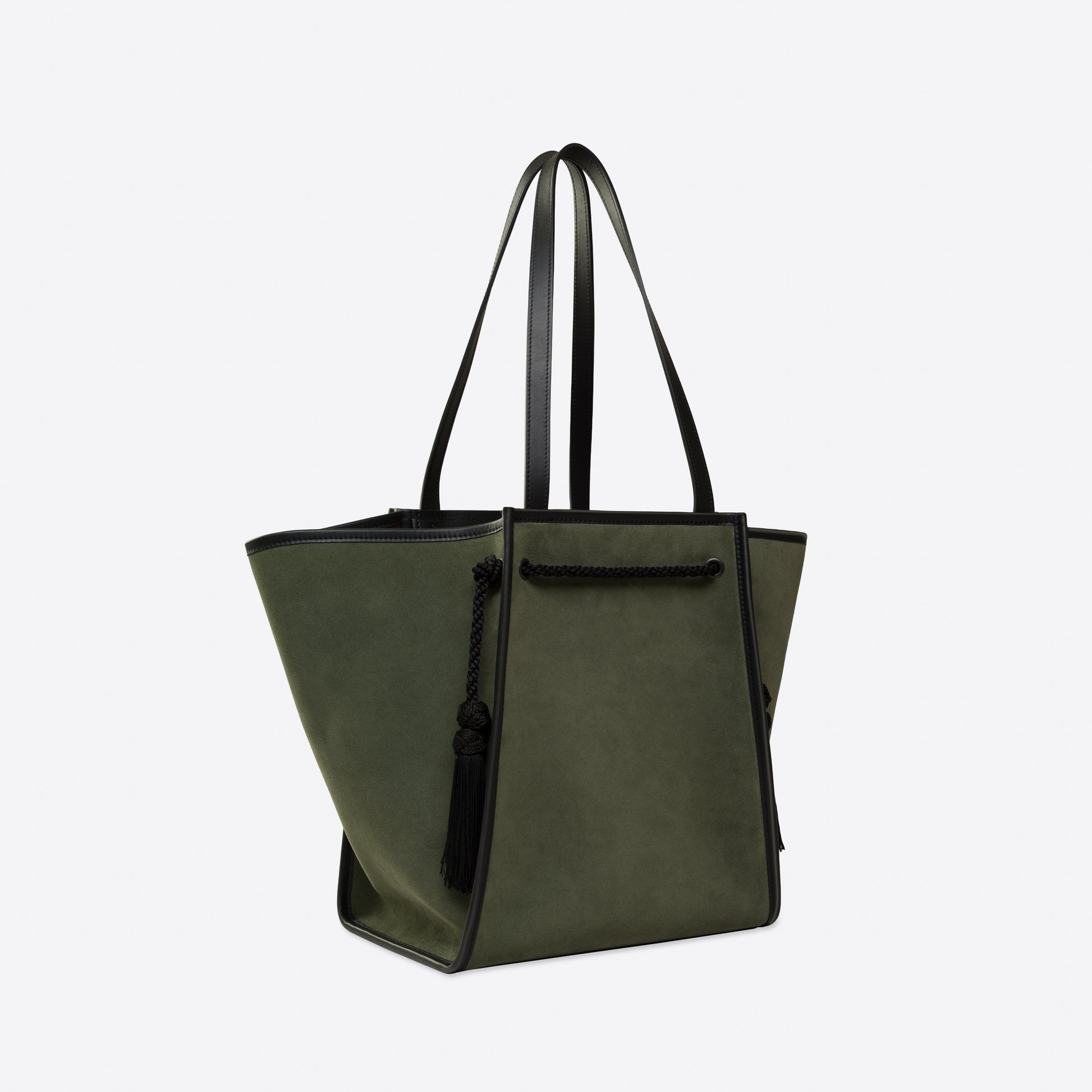 - Outside: Tobacco suede, with black smooth leather bottom and handles. Black trim and tassels.