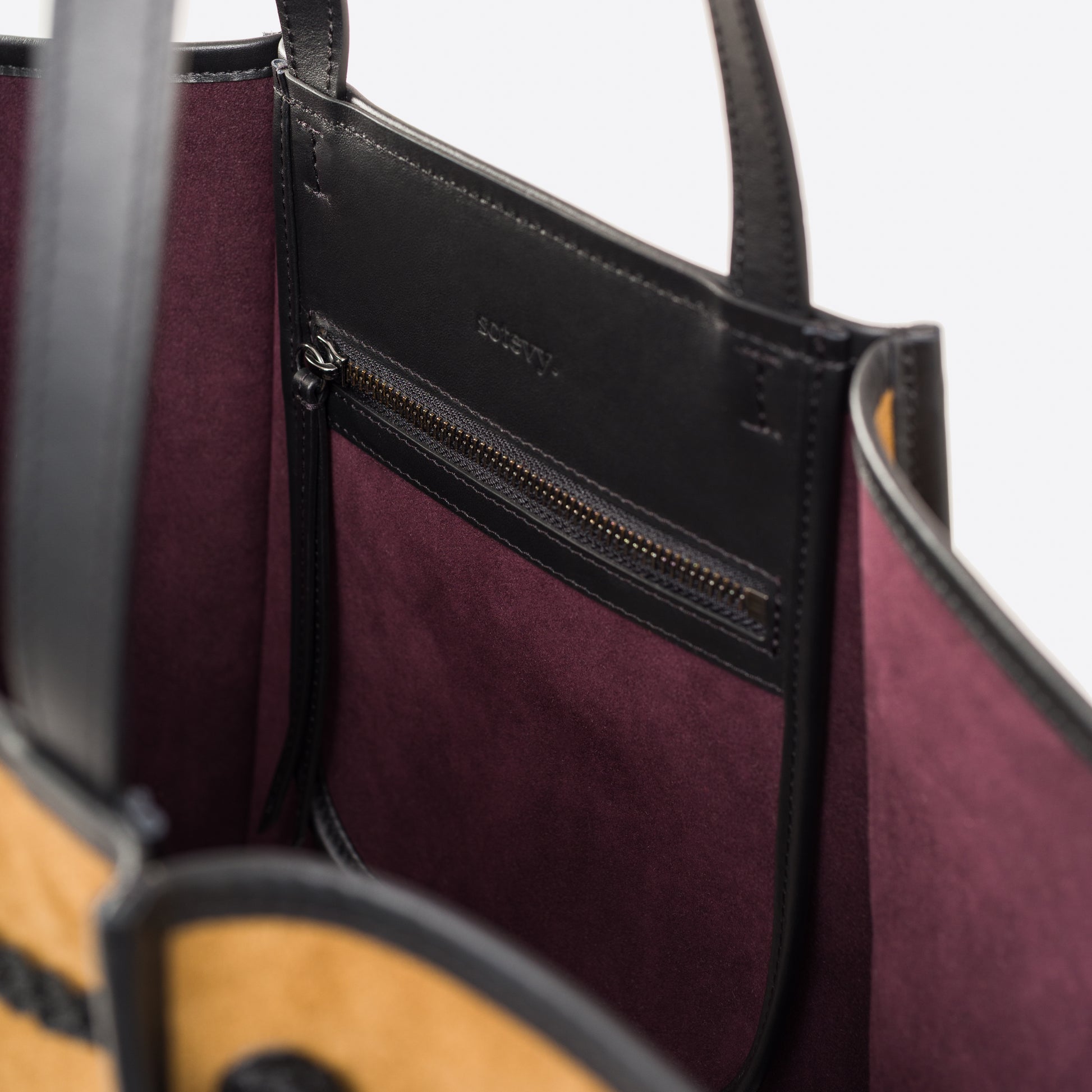 Lightweight and functional, the tote is enhanced by its plum Alcantara lining, adding a touch of refinement. It features a zippered pocket and a slip pocket, providing smart and elegant storage.
