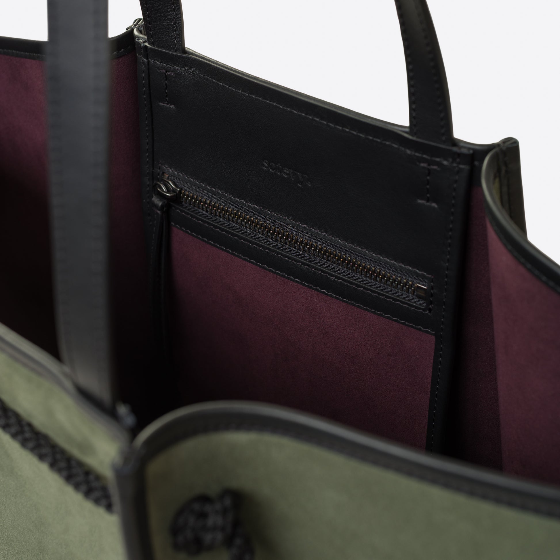 Lightweight and functional, the tote is enhanced by its plum Alcantara lining, adding a touch of refinement. It features a zippered pocket and a slip pocket, providing smart and elegant storage.