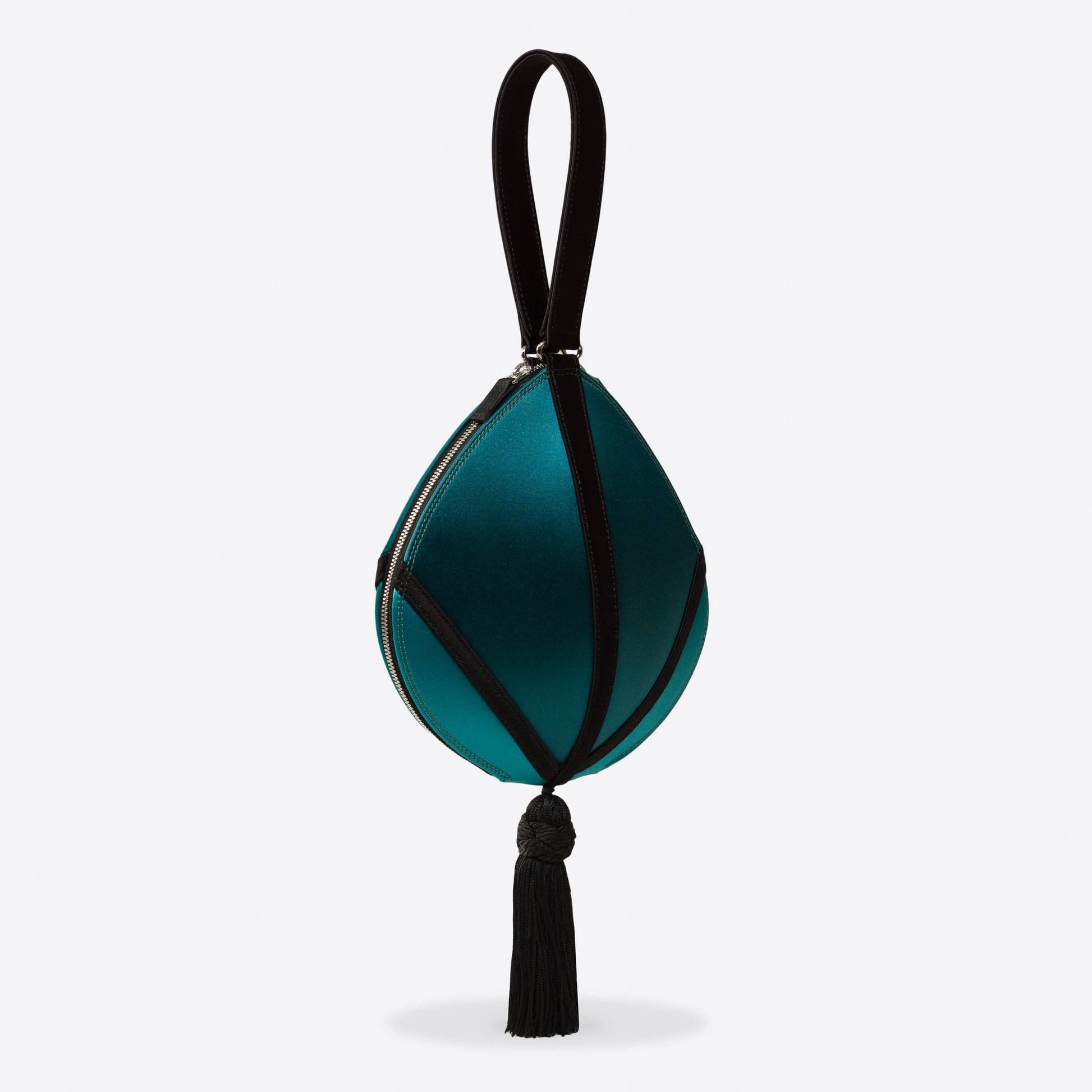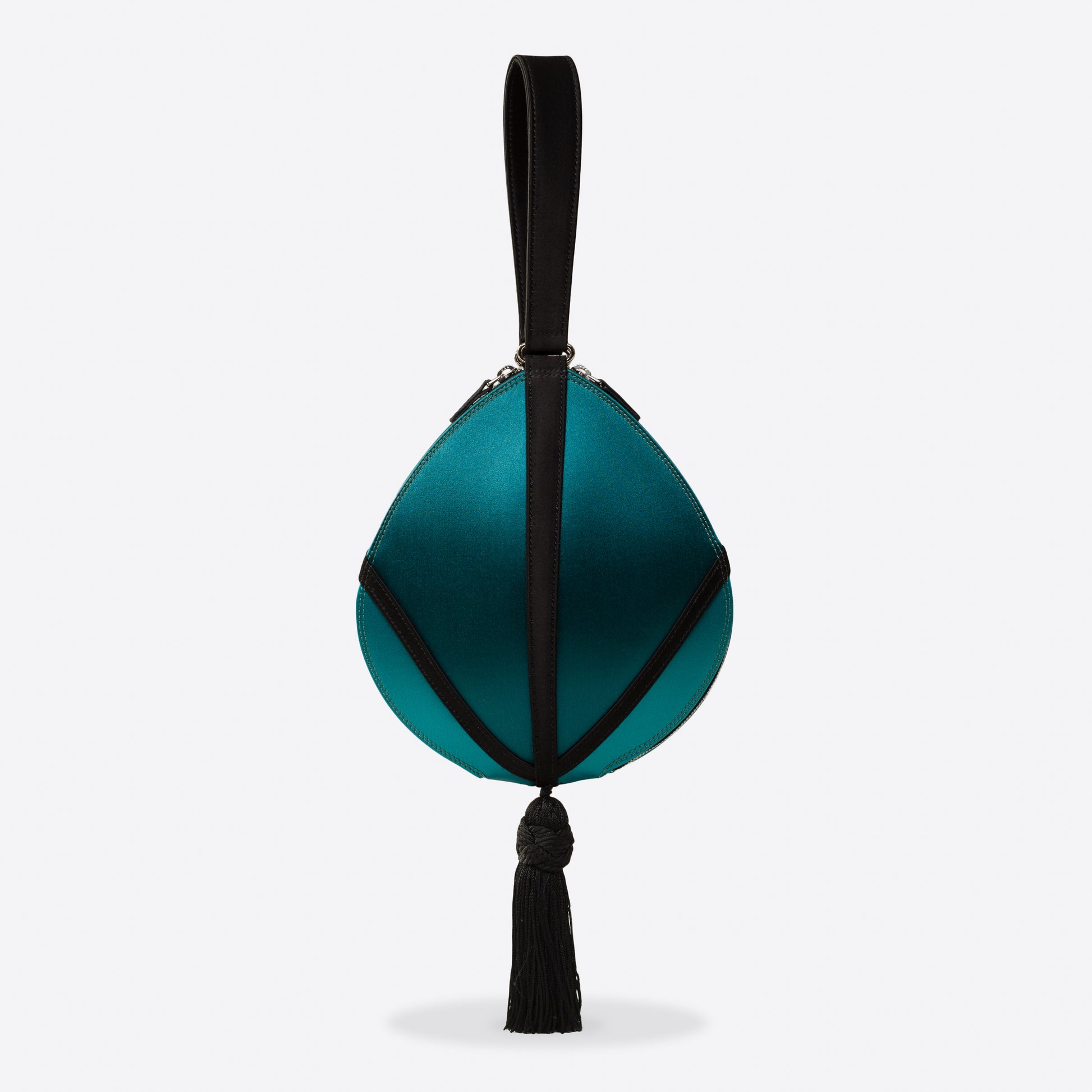 The Lily handbag is a statement of timeless elegance, crafted with meticulous attention to detail. Adorned with contrasted shades of duck blue satin cutouts, it is finished with an exquisite tassel for a touch of sophistication. Its graceful oval silhouette opens seamlessly with dual zippers, unveiling an interior that offers just the right amount of space for your phone, cards, and other daily essentials. The handle wraps comfortably around your wrist, giving you the freedom to move effortlessly while adding a chic flair to any outfit. Perfect for day-to-night transitions, the Lily handbag is the ultimate blend of style and functionality.