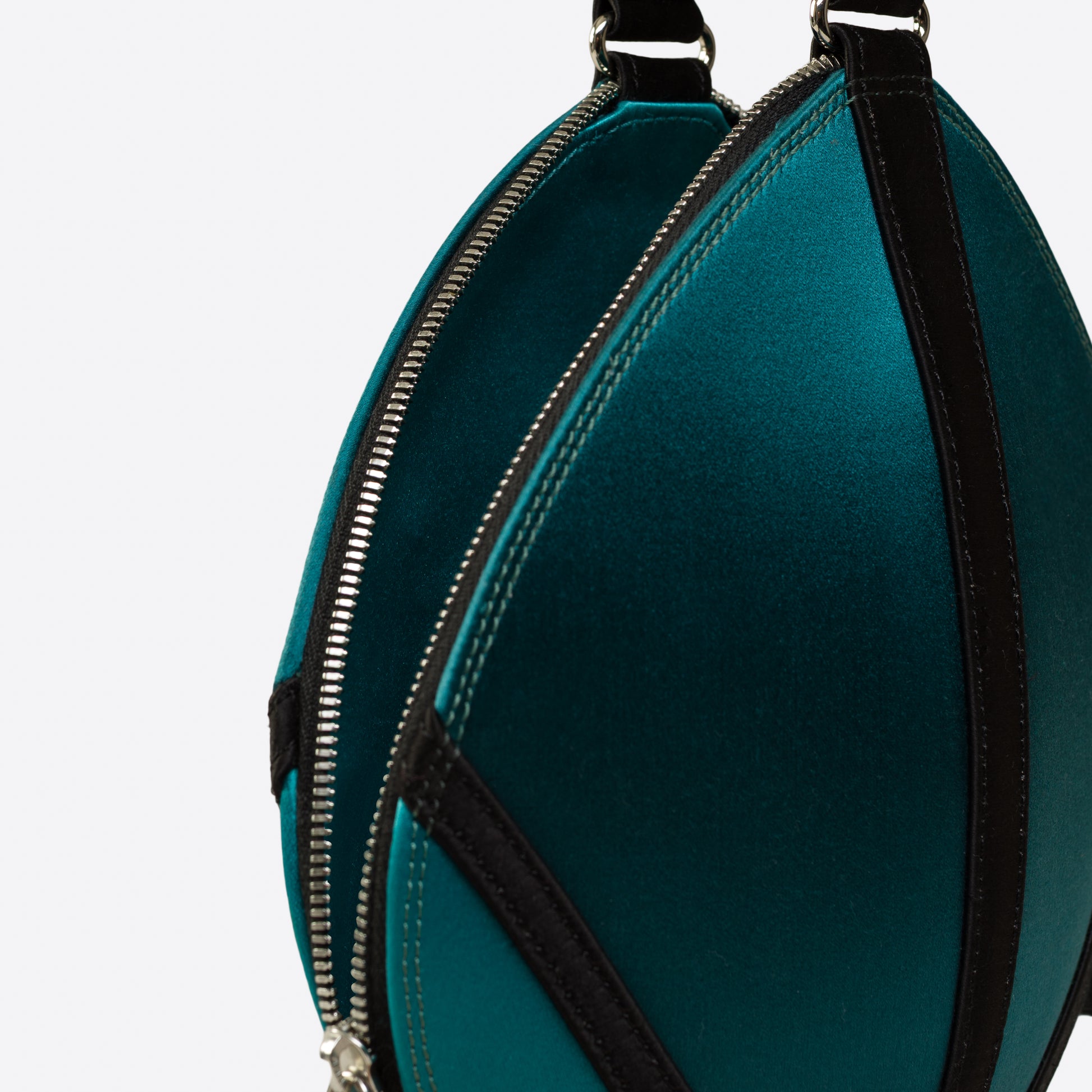 Materials & Colors: Deep and light duck blue satin. Handle and details in black satin.
