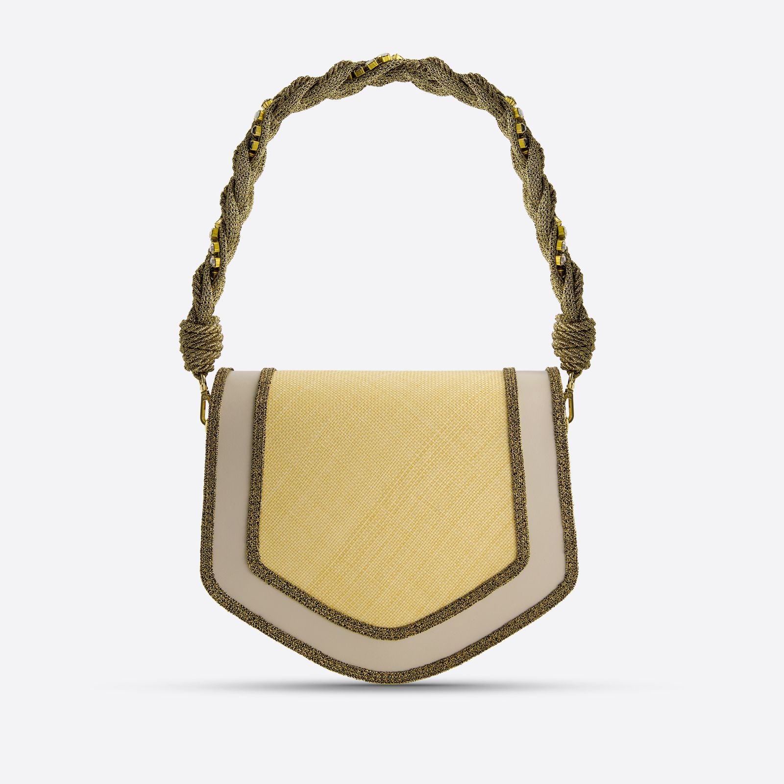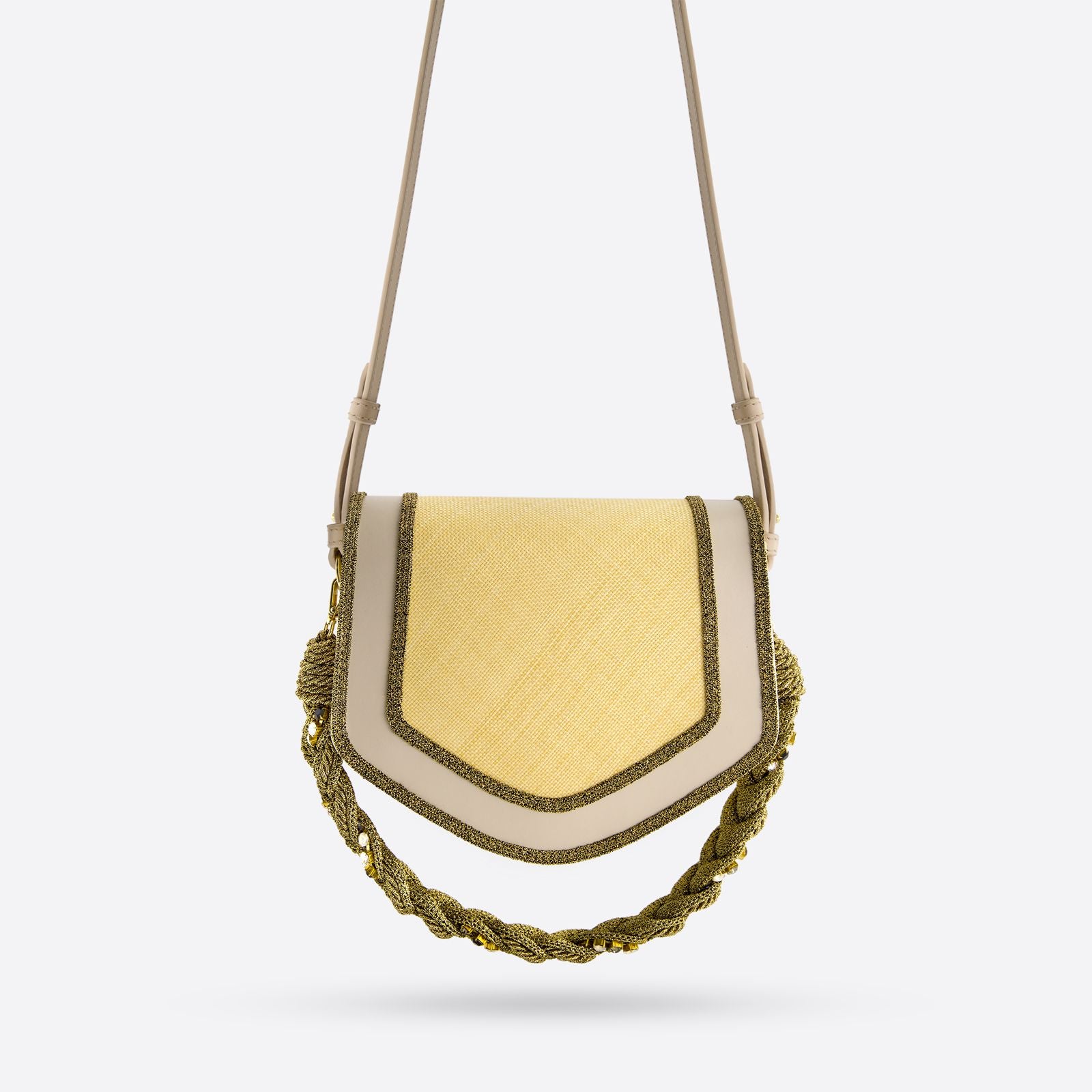 - Outside: Ivory leather and raffia. Hand-braided gold passementerie handle.